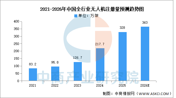 近年來中國無人機注冊數(shù)量快速增加,中商產(chǎn)業(yè)研究院發(fā)布的《2025-2030年中國無人機行業(yè)市場調(diào)查及投資建議報告》顯示,2025年,我國實名登記無人機總數(shù)突破328萬架,累計飛行4530萬小時,同比增長近70%,6型無人駕駛航空器獲頒型號合格證,初步形成覆蓋23個省區(qū)市的飛行服務(wù)網(wǎng)絡(luò)。中商產(chǎn)業(yè)研究院分析師預(yù)測,2026年中國全行業(yè)無人機注冊量將達(dá)363萬架。